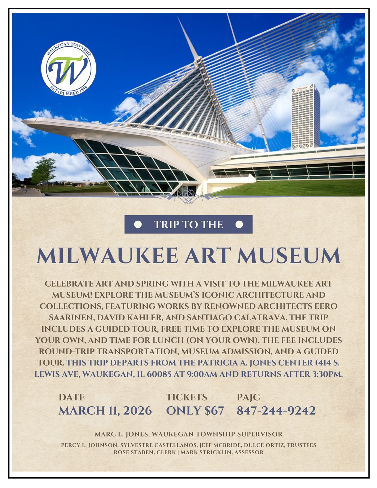 Tickets only $67. This trip departs from the Patricia A. Jones Center, 414 S. Lewis Ave., Waukegan, IL 60085 at 9:00AM and returns after 3:30PM.